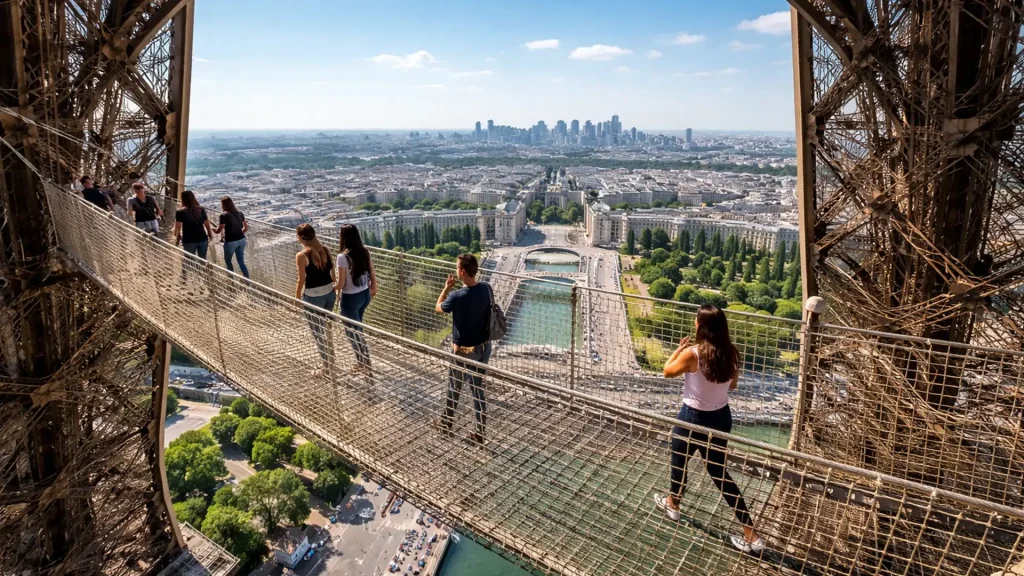 Turnul Eiffel, unul dintre cele mai emblematice simboluri ale Franței și ale lumii, își surprinde din nou vizitatorii prin lansarea unei atracții unice: un pod suspendat din plasă, amplasat la aproximativ 60 de metri deasupra solului. Această instalație temporară oferă o experiență memorabilă celor care doresc să vadă Parisul dintr-o perspectivă diferită și să simtă adrenalina unei traversări la înălțime.